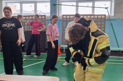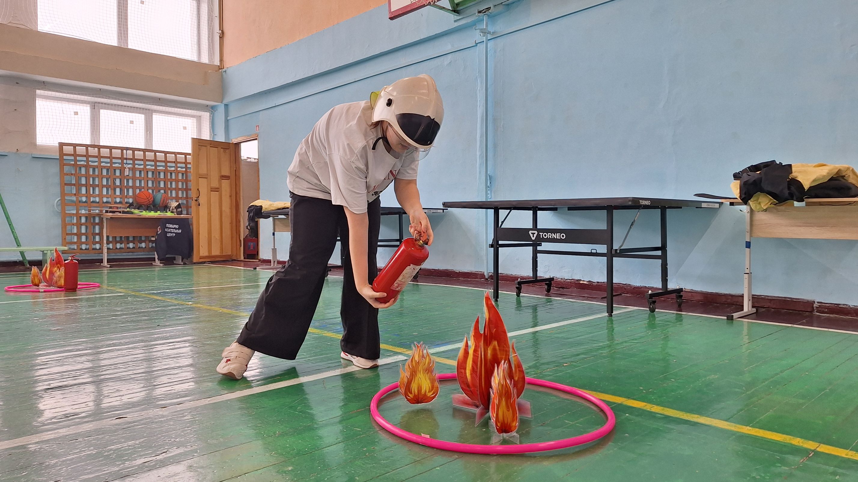 Следующий этап представлял собой полосу препятствий, состоящую из конусов, обручей и матов, а также условного пожара, который ребята тушили с помощью огнетушителя. Всю дистанцию школьники проходили в касках пожарных.