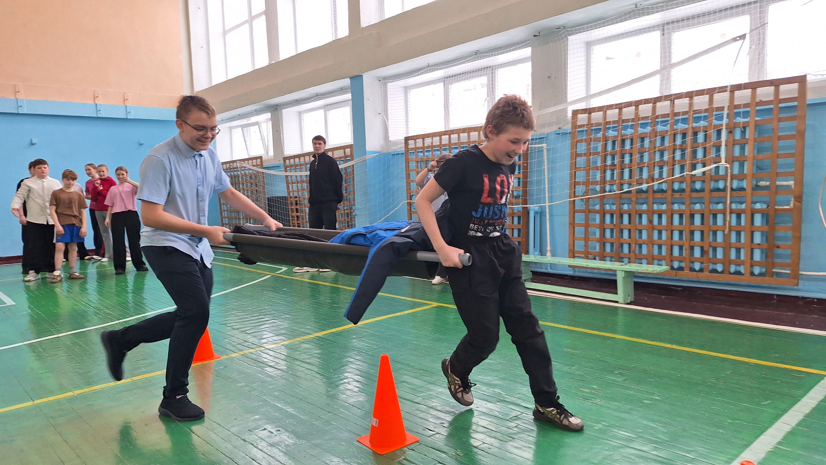 Четвертый этап включал в себя проведение спасательной операции. Команды по парам укладывали «пострадавших» на носилки, а затем преодолевали препятствия. Участникам было необходимо не только быстро справиться с заданием, но и аккуратно и бережно располагать «спасенного» на носилках.