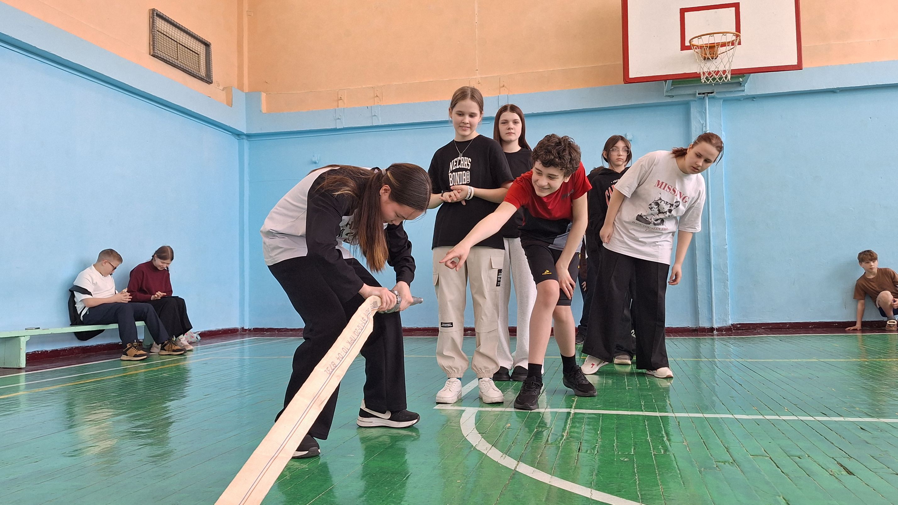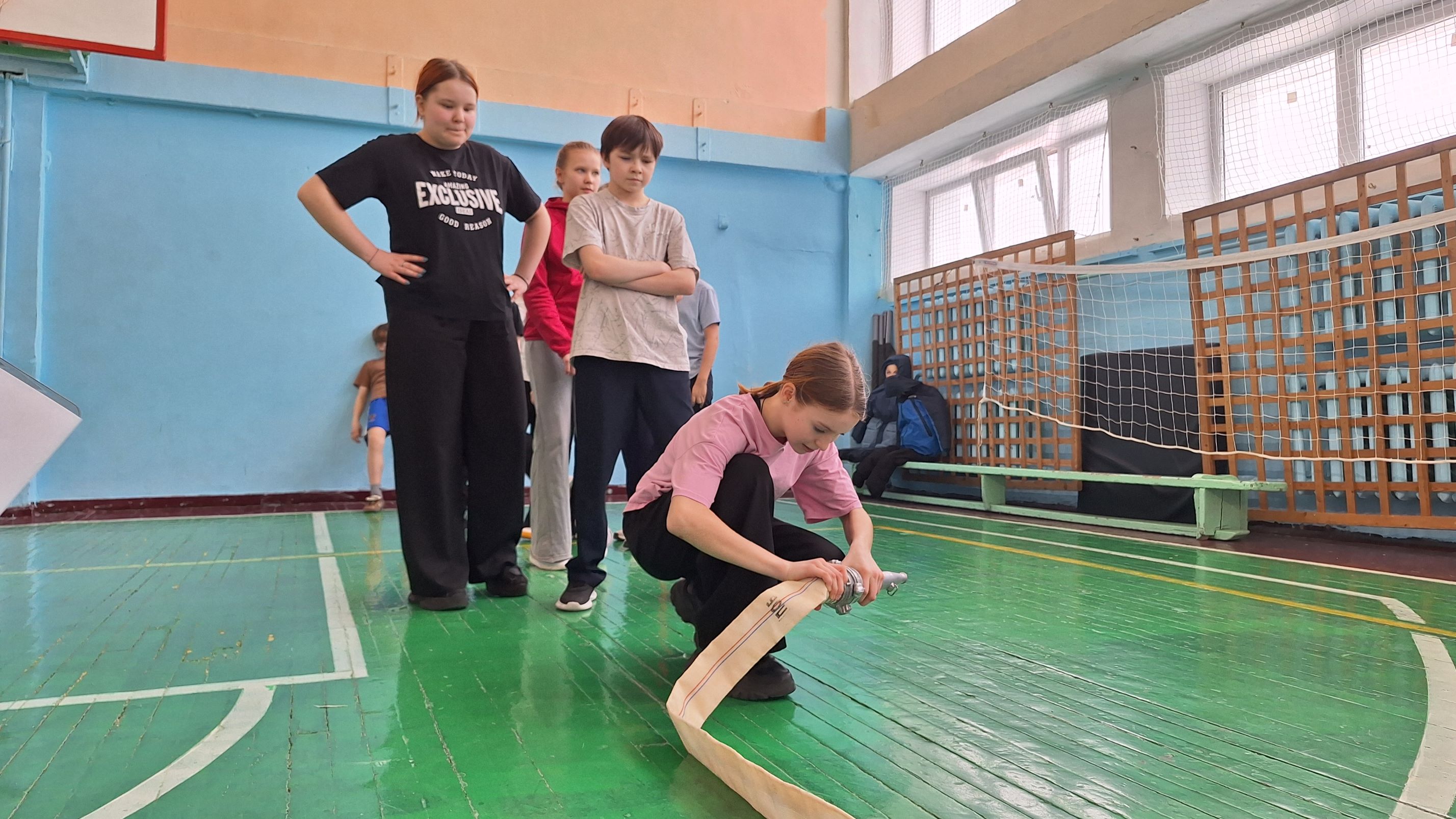 На предпоследнем испытании шестиклассников ждало боевое развертывание. Каждый участник команды добегал до пожарного рукава и присоединял ствол. Добежав до указанной точки, отсоединял ствол. После чего оббегал стойку и возвращался обратно, повторяя те же действия.